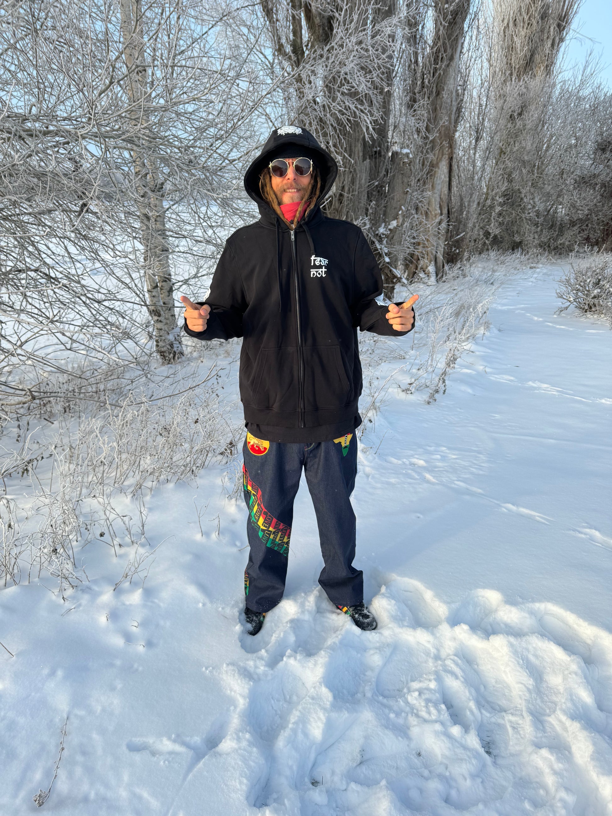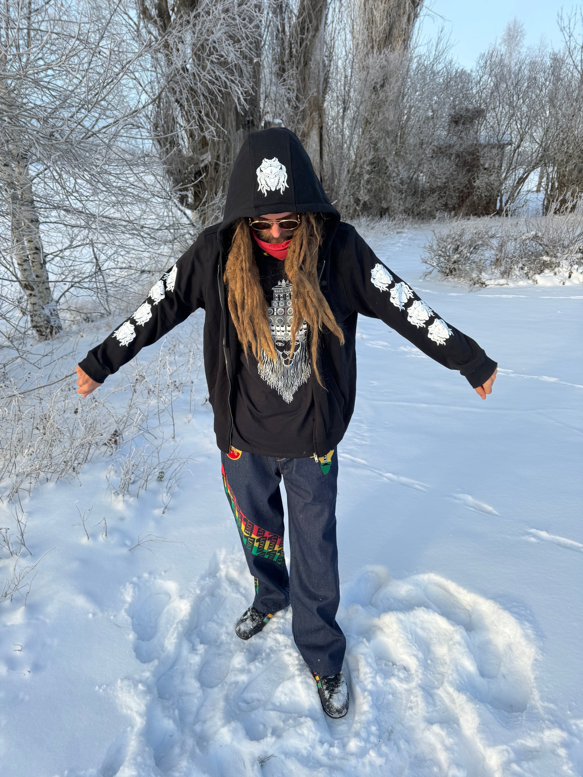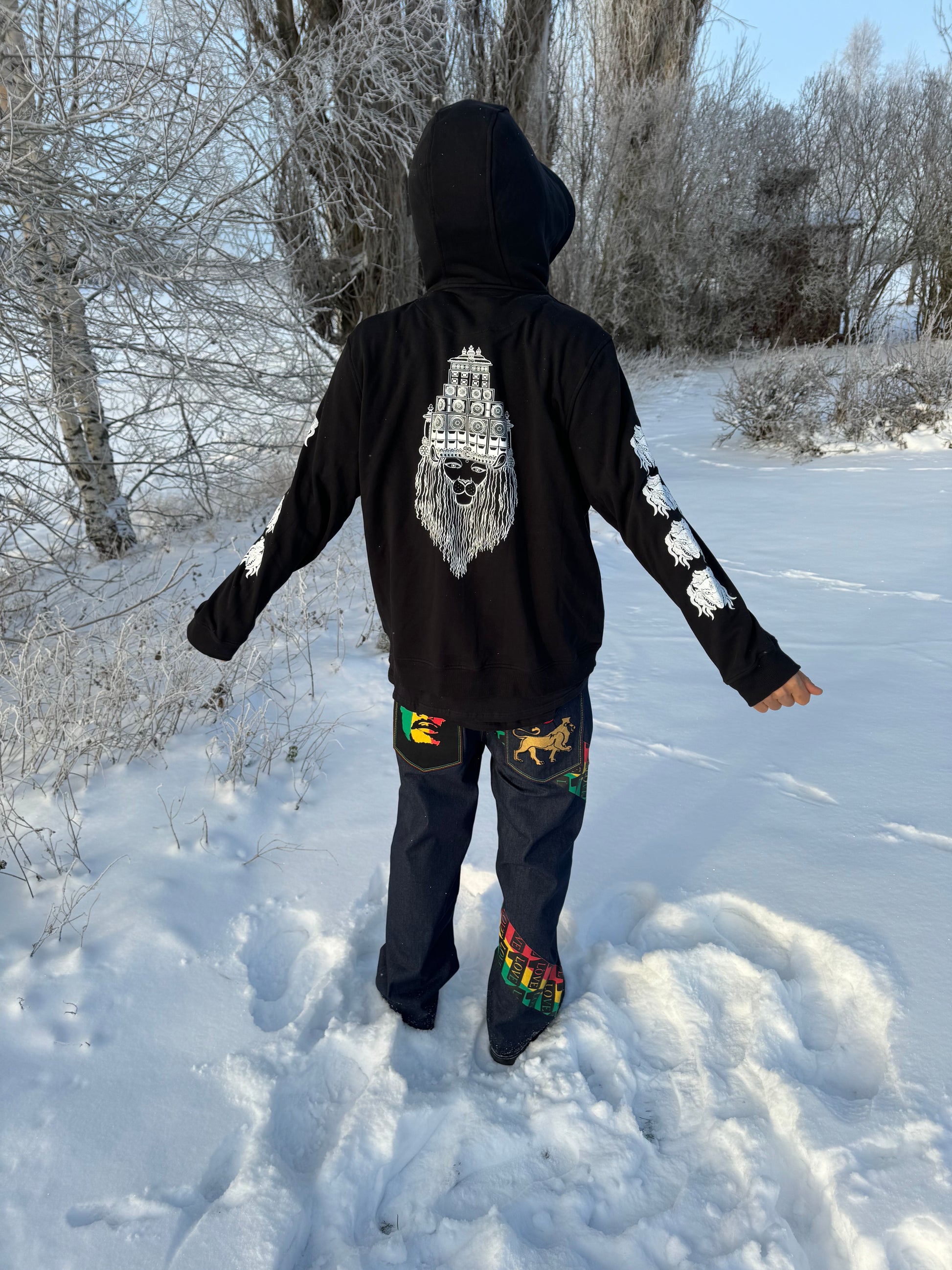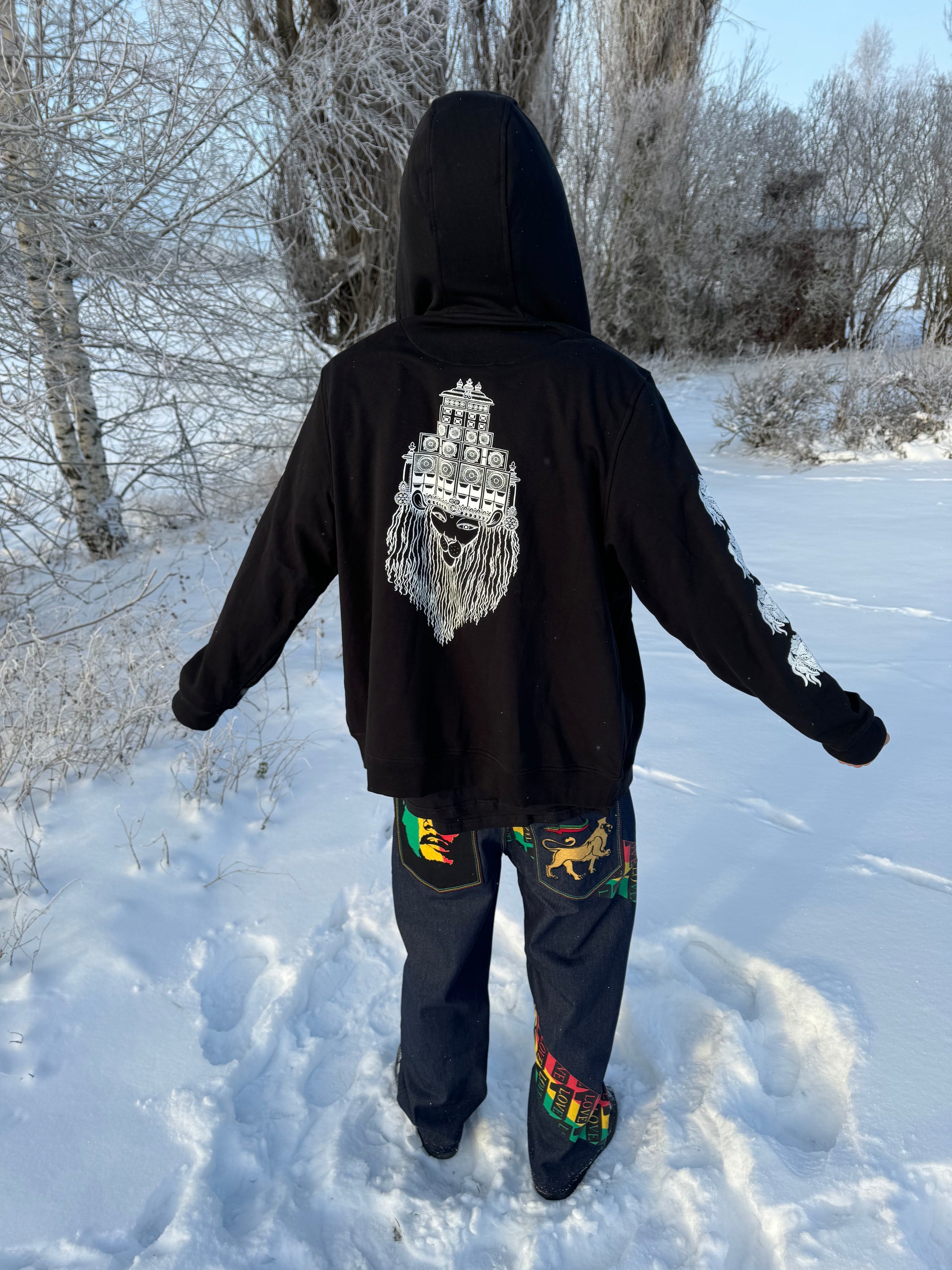 Printed on the front, back, sleeves and hood by our immediate community.